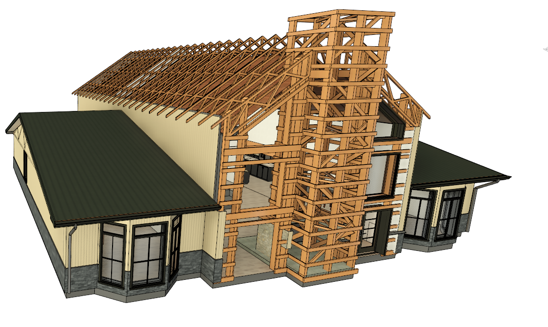 Menominee, MI – This home included a unique structural system being post-framed. Walls included 2×8 columns and horizontal 2×6 wall girts. A 32′ high stone veneer chimney required special vertical and horizontal bracing to meet the stringent deflection requirements for the stone facade.